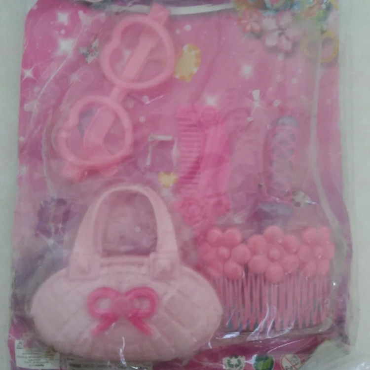 شامل : کیف ، شانه دسته دار ، فر کننده مو پلاستیکی، عینک قلبی و گیره مو
